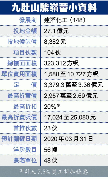 【本報訊】儘管早前香港中文大學滿佈硝煙,相隔一個山頭的九肚山豪宅已隨即推出。建滔化工(148)旗下九肚山駿嶺薈昨突擊開售,本周六先賣23伙,包括推售21幢洋房,當中兩幢「巨無霸」洋房,面積達1萬方呎,料為全新界最巨型一手洋房。項目以先到先得形式發售,並且需要為建滔員工、員工家屬或商業夥伴。買家不能透過地產代理等介紹人買入,不過發展商聲稱有「酌情權」。
