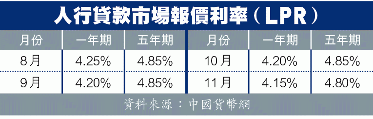 是次乃人行自8月份首次進行LPR報價機制後,第四次公佈報價,也是繼9月份後第二次調降一年期LPR的行動,而今趟五年期LPR亦是首降,經調整後兩者分別減至4.15及4.8厘。LPR是指導新批貸款息率的座標,當局每月20號公佈最新定價,上月份則未有改變。