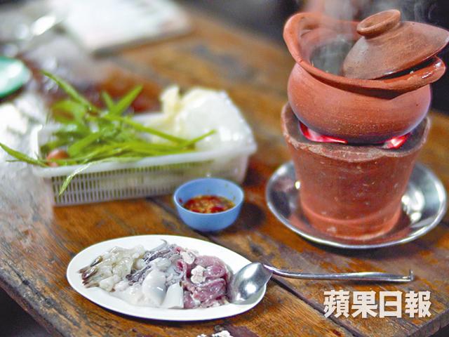 一個小砂鍋,自家熬的高湯,配上辣椒、香茅和薄荷葉,食物可選擇牛豬雞肉或海鮮,另外會配一籃通菜、白菜、一隻雞蛋和一包粉絲。泰國人習慣肉要先蘸蛋汁,才放進鍋中涮來吃,先肉後菜,最後是粉絲。與香港打邊爐不同,最後的湯是必喝的,因為炭爐可以從猛火自然降溫到文火,到最後即使沒有了火,還有餘溫,這樣煮出來的湯格外鮮美,非電磁爐或石油氣爐可比。