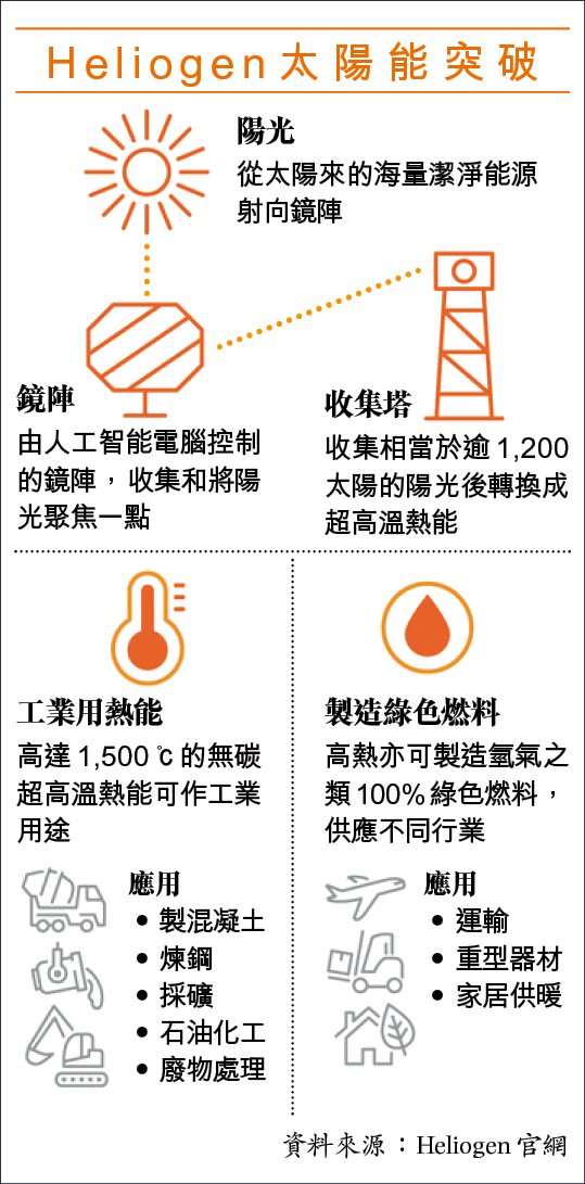 一直在加州洛杉磯秘密研發潔淨能源的Heliogen,前日發表成果,公司創辦人兼行政總裁格羅斯(Bill Gross)形容是太陽能研發的「聖盃」:「我們正發展科技,可以壓低化石燃料價格,同時不製造多餘二氧化碳排放。」