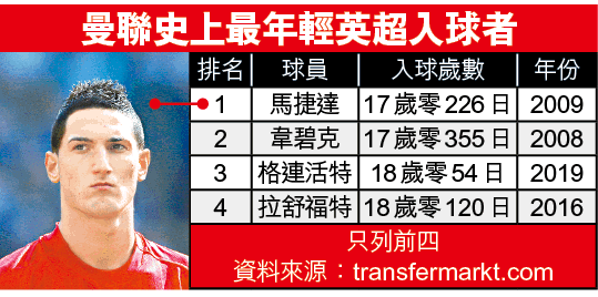 此外,和車路士一樣大打青春風暴旗號的曼聯,今季19球個聯賽入球,全數都是由23歲以下的球員攻入。今場18歲的格連活特、19歲的班頓威廉斯及22歲的拉舒福特分別建功,是自1996年以來首次有3名22歲或以下「魔兵」在同一場英超為曼聯入球(見附表),對上一次則是在96年4月對諾定咸森林時由「七小福」中的傑斯、史高斯和碧咸建功,當時3位魔兵助球隊主場大勝5:0。