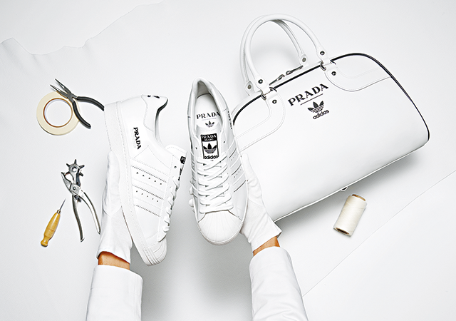 Win win的巨牌結合戰,大大小小每日都有,近期話題之一要數Prada和adidas合作出波鞋,話口未完,聯名系列昨日正式亮相。Prada for adidas會以怎樣形式合作?最終結論由Prada負責製作,以adidas明星鞋款Superstar做主角,配一款保齡球手袋,全球限量700組,預計下月4日開賣。揀中Superstar皆因這款old school波鞋今年誕生50周年,全白配黑色細節都回歸簡單。