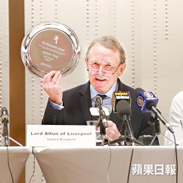香港眾志秘書長黃之鋒出戰海怡西選區,惟最後被「DQ」,Lord Alton指對黃不能出選感到傷感。黃早前申請離港到英國領取「西敏寺人權獎」,法院卻以他潛逃風險高為由,不准他離港。Lord Alton親手把獎項帶到香港,當他拿出獎項時,全場拍掌致敬。小組昨午頒獎予黃之鋒。