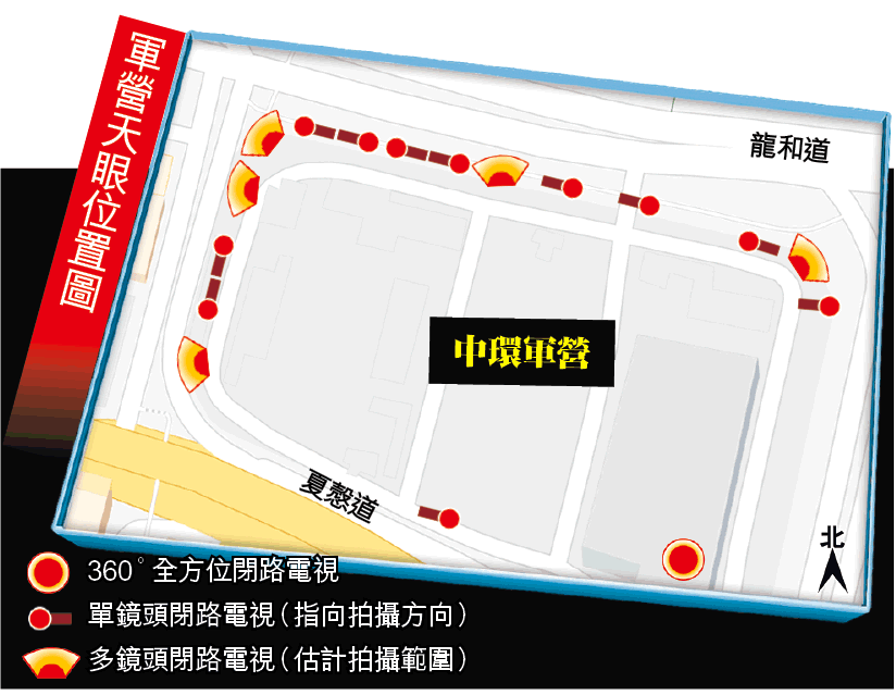 至於浸大旁的東九龍軍營,亦有約七部多鏡頭閉路電視,型號與槍會山軍營斜坡和部隊醫院的閉路電視相似,廣角鏡頭分別朝向聯合道和聯福道交界、浸大校園以及窩打老道路面。東九龍軍營內至少有兩幢大廈天台亦設置監控鏡頭。連同圍欄10多部單鏡頭閉路電視,該軍營的閉路電視鏡頭超過20個。
