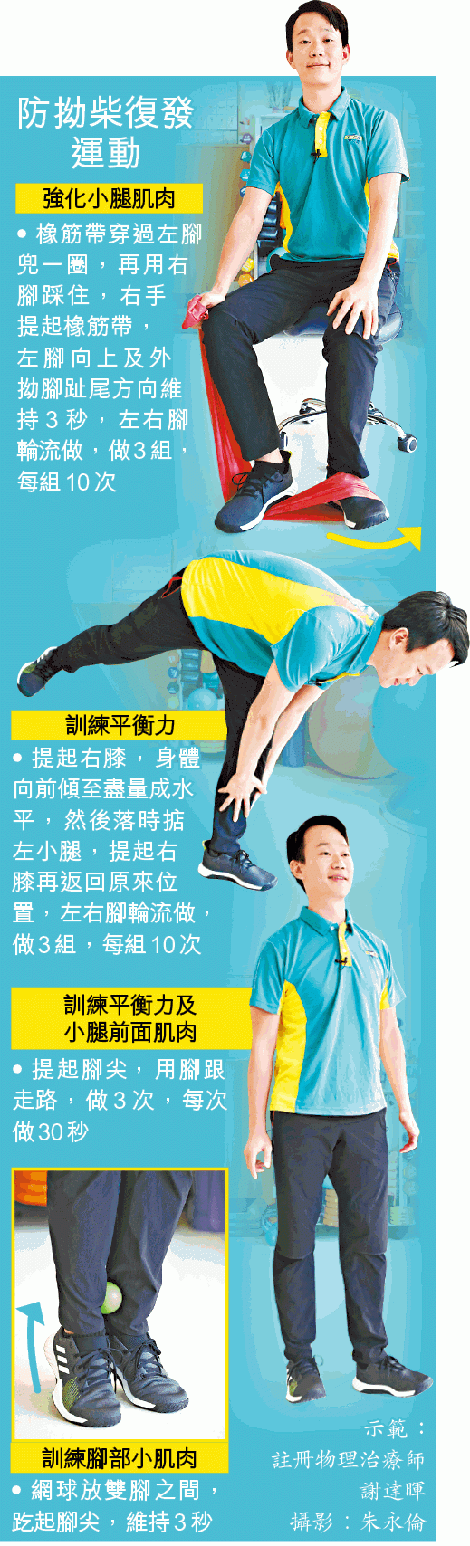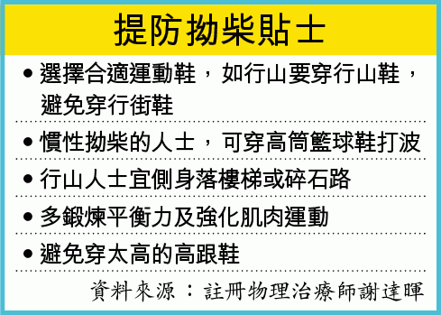 【本報訊】拗柴變得習以為常要小心,物理治療師表示,一般人容易忽略拉傷韌帶的一級拗柴,治理不當長遠可造成關節纖維化,影響活動能力,重複拗柴更可形成骨刺。多鍛煉平衡力、強化下肢肌肉,可預防拗柴復發。