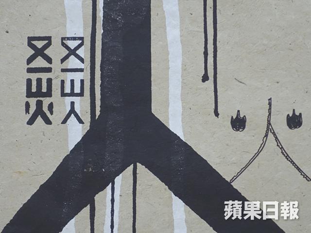 展場當眼處就有又一山人和「九龍皇帝」曾灶財隔空「合作」的系列作品《港人治港》。山人在皇帝的遺墨寶中抽出字體甚至部首,重組句子,印於紅白藍尼龍布上,成為市井的香港家書,字裏行間揶揄社會和香港前途。