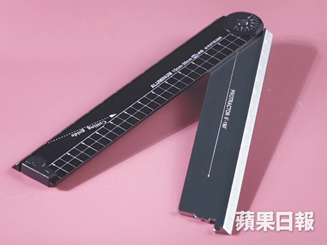 筆袋面積有限,高畑先生便選Hi Line摺叠式鋁製間尺,僅長15厘米可放於筆袋中,打開後可延長至30厘米。這間尺曾獲得2015年日本Good Design Award,最大的特色是邊緣的角度十分適合撕紙,表面還有標記,教用家調校撕紙的角度。