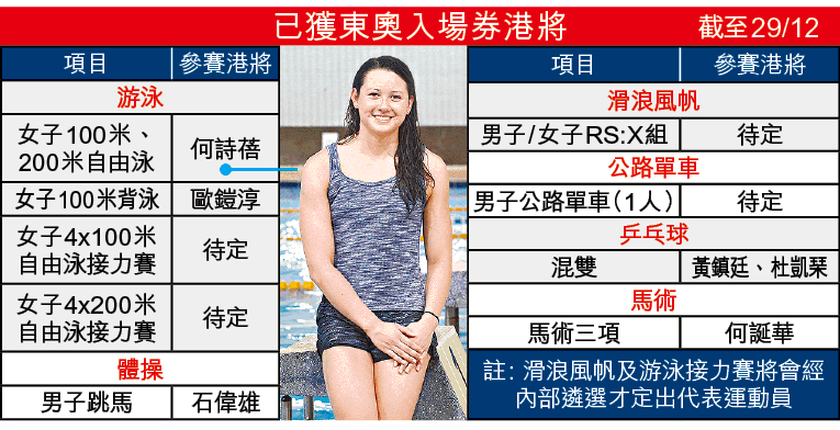 東奧明夏進行,游泳女將何詩蓓成為首位得到參賽資格的香港代表,她在今年四月由美國回港出戰香港計時賽,最終在100米及200米自由泳均達奧運A標,加上香港在兩項女子接力均得到東奧入場券,何詩蓓有機會在東奧出戰四項賽事,下半年更打破50米蛙泳及200米自由泳的亞洲紀錄,200米自由泳的成績更獲國際泳聯(FINA)承認為今年最快時間。另外,歐鎧淳亦在八月出戰游泳世界盃新加坡站時,在100米背泳造出1分00秒22香港紀錄,同時達到奧運A標,將成香港首位四戰奧運的女子游泳代表。香港目前已取得東奧資格的,除游泳五個項目外,尚有人選未確定的公路單車、滑浪風帆、鐵定由石偉雄出戰的體操跳馬及馬術等(見附表)。