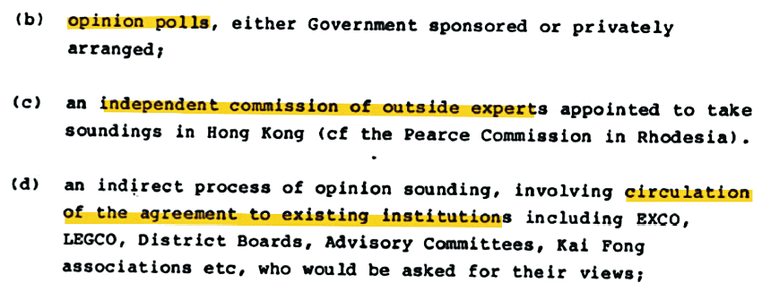 除了這兩種比較常見的民意收集方法,英國一度想到透過公投形式,讓全香港市民表決是否接受《中英聯合聲明》,亦考慮過用民調方式收集民意。另外,英方曾經考慮參考其他殖民地解殖經驗,邀請海外專家成立獨立委員會,收集市民有關前途的意見。