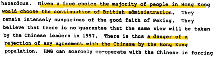 一旦提交國會辯論,議員必問的問題是「香港人是否同意相關協議」,這對英方官員而言相當頭痕。根據英國最新解密檔案,測試港人對於中英雙方協議的態度,政治上對英方相當不利,皆因英方知道香港社會整體氣氛對北京抱有懷疑,不相信中共在1997年後會信守承諾,一旦香港人可以自由選擇,大部份港人一定選擇維持英治。