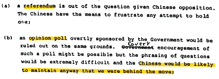 因此檔案顯示英方當年思考的不是如何確實反映香港人的意願,更多的是如何防止中英初步達成的協議不要付諸東流。例如英國外交部香港司寇立夫(R. D. Clift)提交報告時表明,若然香港市民否決中英之間的協議,英方就會進退維谷,一方面又不能與中方合謀,將方案強加於香港人,但若然英方將協議交還中方,要求加入更多有利港人的條款,爭取港人支持,又擔心被中方視為別有用心。