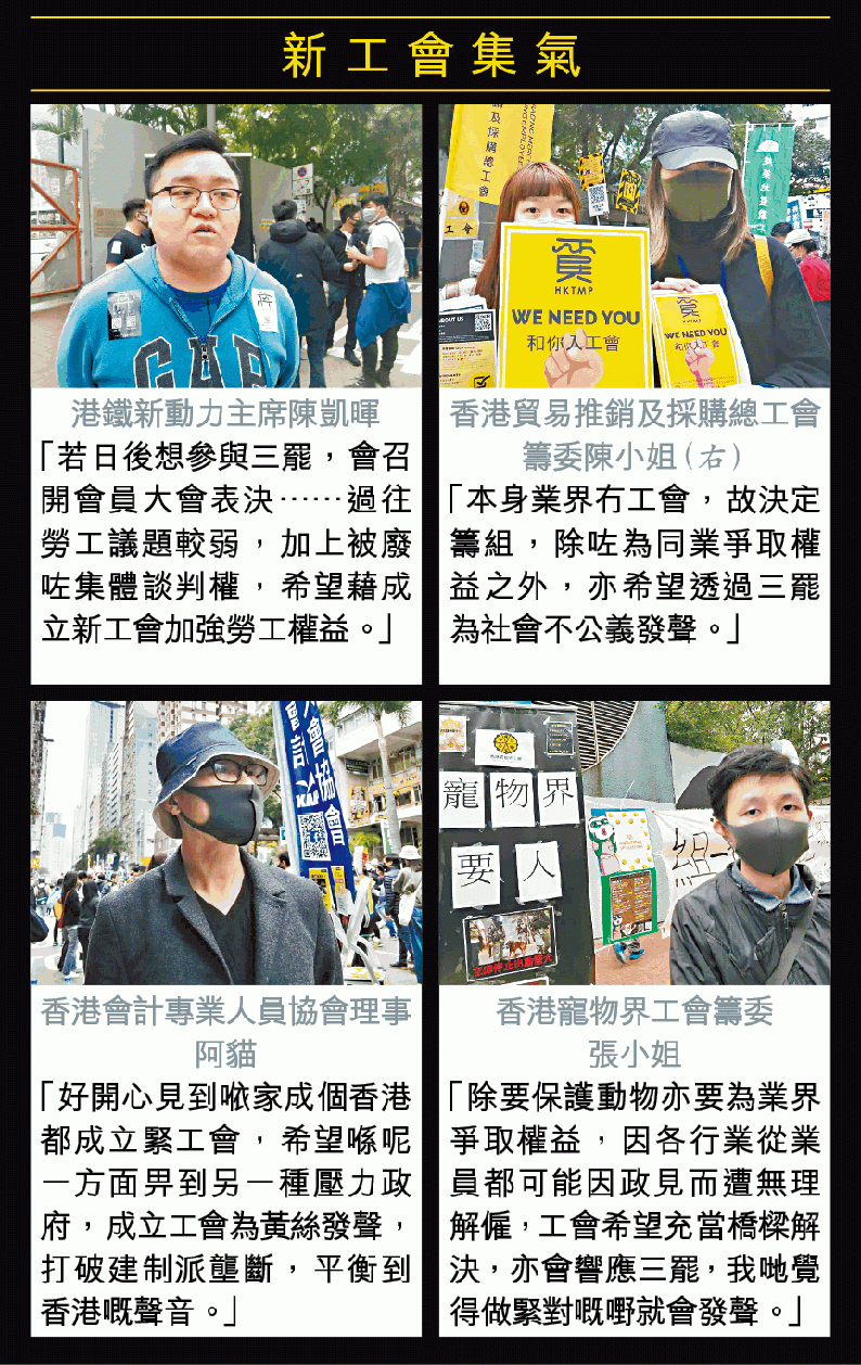 一場反送中運動,促使多個新工會成立,凝聚勞工界抗爭力量。逾40個新成立或籌備中的工會昨在灣仔修頓球場外及中環遮打行人專用區設街站,宣揚理念及招收會員,包括香港會計手足工會、香港製藥及醫療儀器業職工總會、舞台藝術工會及香港酒店工會等。