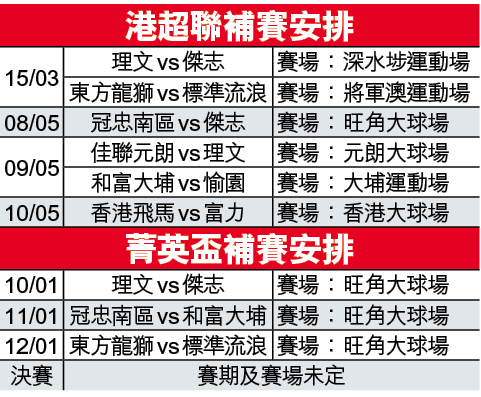 足總周二公佈,原定今年10月初舉行的6場港超聯以及1場11月初舉行的菁英盃賽事,均已安排新賽期,當中2場港超聯賽事安排在明年3月15日進行,當日本來已有兩場菁英盃賽事,理文對傑志的比賽因而受影響,提前在明年1月10日進行;原定在明年5月9日上演的菁英盃決賽,亦會改期,但暫未有比賽日期。