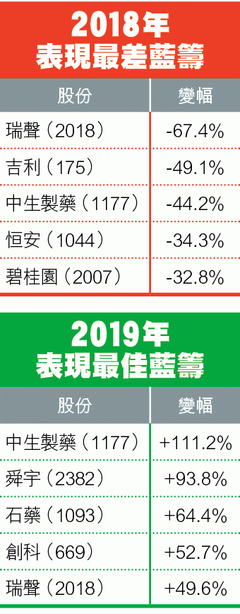 值得一提是中生製藥(1177),該股在2018年插水44.2%,為跌幅第3大藍籌,但去年面臨官方集中採購降低藥價的負面因素下,股價仍絕地反擊狂升111.2%,演繹「醜股大翻身」!