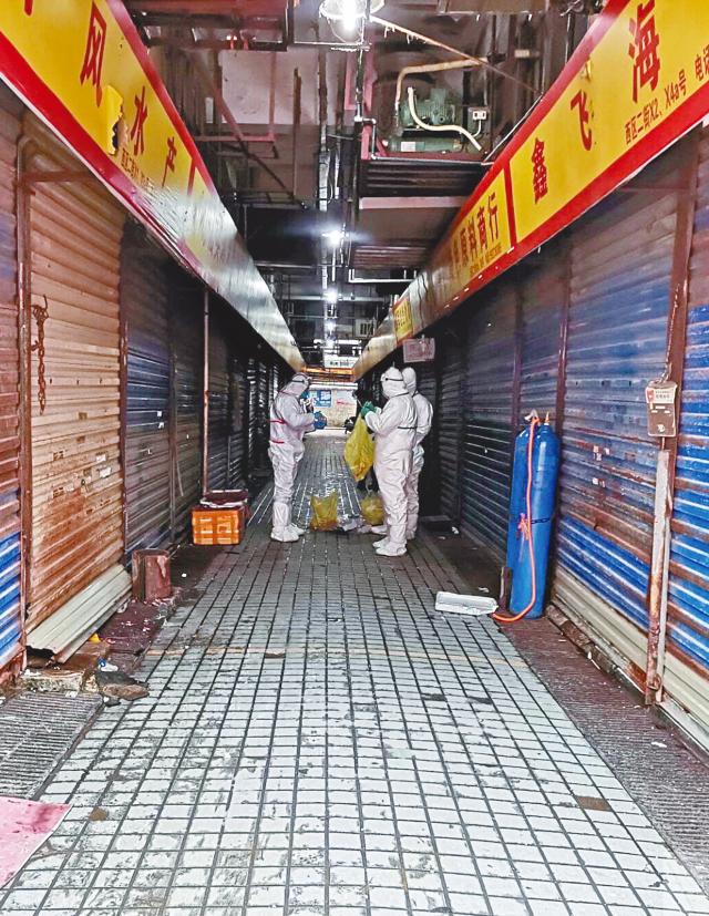 當局昨宣佈暫時關閉街市,整頓環境衞生。照片顯示,市場外停滿政府車輛,外圍有大量城管人員及清潔工人,主要出入口及東西兩區各街出入口均設置紅色水馬,警察亦戴上口罩在場戒備,大部份店舖昨已經關門停業,穿上白色保護服的工作人員在一間水產店用液體擦拭水箱,收集樣本,大批檔主紛紛趕返街市,連人帶貨離開現場。