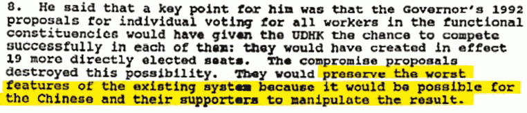 由於讓步方案放棄開放功能組別個人票,李柱銘便向包雅倫指出,英方一旦讓步,容許功能組別議席繼續以團體票或公司票產生,只有管理層有投票權,變相令北京可以操控選舉結果。他透露,北京政府1991年立法局選舉期間,便以「中國生意」威脅當時在任的何世柱放棄連任,改由黃宜宏取得中華總商會的商界議席。