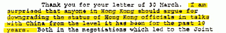 彭定康在信中指出,自80年代中英談判起,一直有香港官員加入英方團隊參與談判過程,坦言相當驚訝居然會有香港人主動要求為香港官員地位降格,甚至認為香港官員參與談判是唯一障礙;更反問曾鈺成「中方一再堅持一改慣例,剔除香港代表,這難道不是談判唯一障礙?」(編按:《蘋果》本周二就上述檔案內容向曾鈺成查詢,至截稿前仍未回覆。)