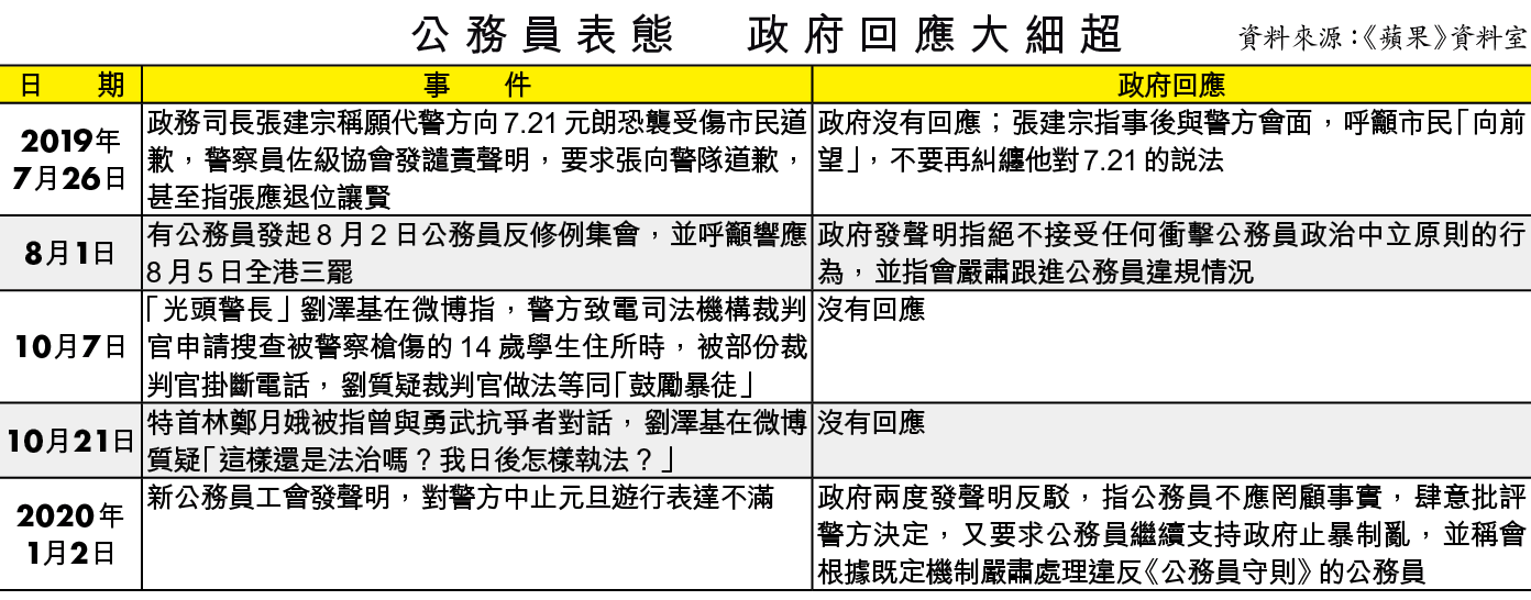 政府昨凌晨12時30分發聲明,對於有公務員工會於社交媒體表示不滿警方提早結束元旦遊行,深表遺憾,指公務員不應該肆意批評政府政策及個別部門的執法行動,否則會根據既定機制嚴肅處理。