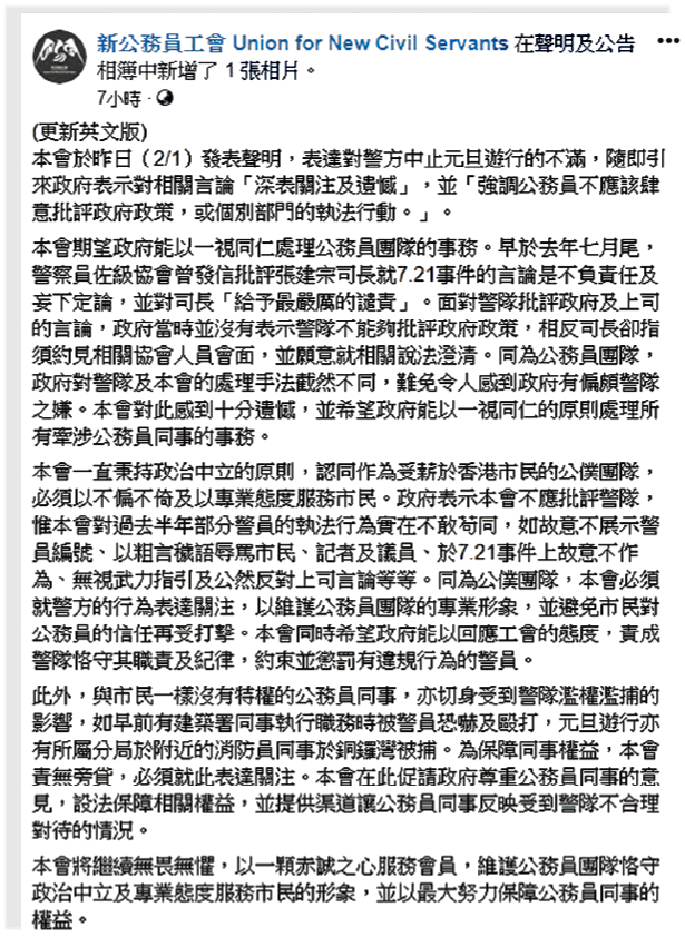 新公務員工會其後發聲明回應,強調該會秉持政治中立的原則,但對過去半年部份警員的執法行為實在不敢苟同,「本會必須就警方的行為表達關注,以維護公務員團隊的專業形象,並避免市民對公務員的信任再受打擊」,希望政府能以回應工會的態度,責成警隊恪守職責及紀律,約束並懲罰有違規行為的警員。