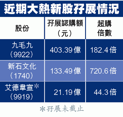 新石文化的集資額雖然較細,在公開發售部份集資最多1,850萬元,但獲逾133億元孖展額湧入,超購逾720倍,有指連同其他銀行黃表及白表數字,最終或能破千倍。資料顯示,去年超購王冠軍是達1,440倍的赤子城(9911),該股公開發售部份的集資上限是2,448萬元,首日升93.5%收市,新石文化的超購倍數有望追上兼成為今年「超購王」。與九毛九一樣,新石文化今午截止現金認購。