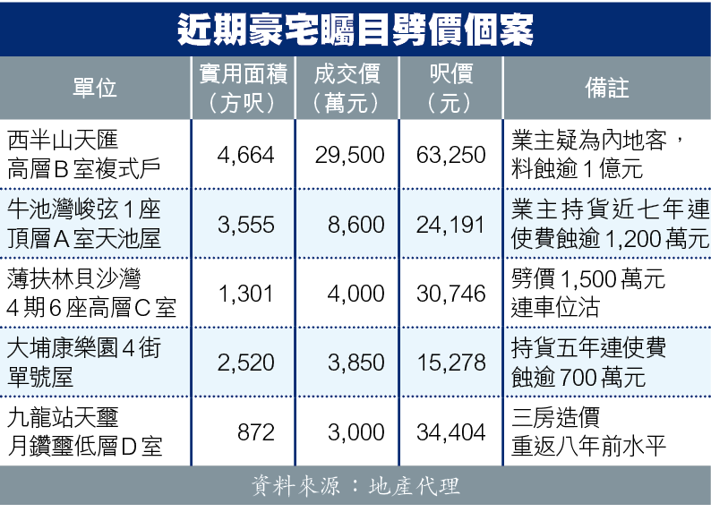 前「亞洲樓王」、曾捲入大規模撻定醜聞的西半山天匯,剛出現首宗複式戶蝕讓。消息指,天匯高層B室複式,實用4,664方呎,剛以約2.95億元沽出,呎價63,250元。原業主疑為內地客,2015年斥3.92億元一手買入,現沽出物業未計使費賬面已蝕9,700萬元,若計及其他開支,料勁蝕逾1億元。