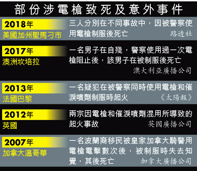 【本報訊】電槍被分類為低殺傷力武器,有美國電槍生產商指遭電擊後的嚴重受傷或死亡率為100萬分之13.1,但其實電槍自上世紀70年代被研發應用後,每年不乏死亡個案,單是美國就有逾千人的死亡是涉及警方使用電槍攻擊,其中逾150人被法庭裁定電槍攻擊是死因或影響因素。