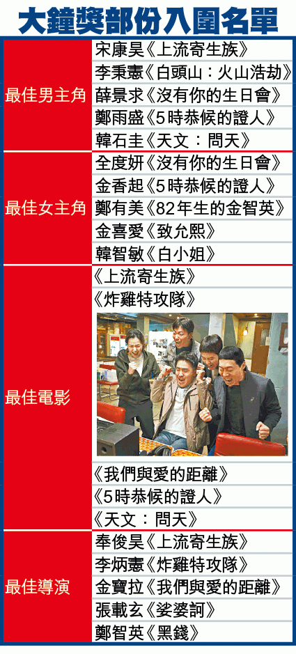 韓國影壇盛事「大鐘獎頒獎禮」近年屢爆欠公正性的醜聞,不少一線巨星都拒絕出席,星光黯淡。而原定去年11月舉行的「第56屆大鐘獎頒獎禮」,將延至下月25日在慶熙大學和平殿堂舉行。昨日大會公佈提名名單(詳見附表),《上流寄生族》以大熱姿態入圍合共11項提名,成眾電影之冠,當中執導《上流寄生族》的名導奉俊昊入圍最佳導演,他和韓振元亦入圍最佳劇本,至於男主角宋康昊就有份爭影帝,到時更會與《白頭山:火山浩劫》的李秉憲、《沒有你的生日會》薛景求及《5時恭候的證人》鄭雨盛等人爭獎。《上流》其他提名還有最佳電影、最佳男配角、最佳女配角、最佳攝影、最佳剪輯、最佳燈光、最佳音樂、最佳美術。