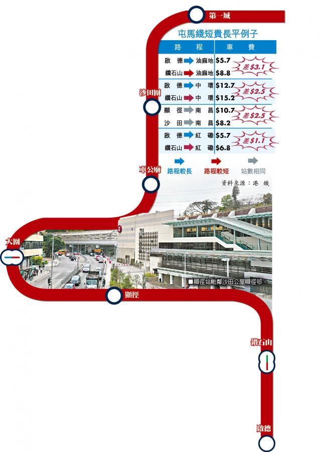 【本報訊】港鐵屯馬綫一期敲定2月14日情人節通車,當中包括三個新車站,即顯徑站、鑽石山站擴建部份及啟德站,由大圍前往鑽石山可縮短一半時間。但屯馬綫車費表出現不少「短貴長平」的不公平情況,即車程較短,反而比較長車程貴約1至3元不等。有立法會議員批評屯馬綫車費混亂,要求港鐵於屯馬綫全線通車後全面檢討。