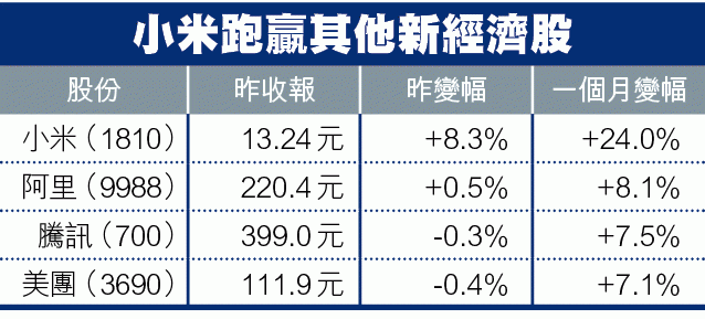 內地傳媒報道,5G手機「小米10」標準版獲工信部入網許可,預料下月發佈,小米昨曾飆逾一成至13.46元,成交額亦超越騰訊,錄56.73億元位列第二,淨吸2.85億元北水;小米最近一個月已獲北水淨買入逾5億股,累積升幅達24%,但與2018年招股價17元仍有一段距離。東驥基金管理董事總經理龐寶林表示,小米的手機銷售數字,無論國內或海外均增加約一倍,反映產品質素及價格受歡迎;受惠全球進入換機潮,他預料小米增長速度加快,短期內有機會重返16元。