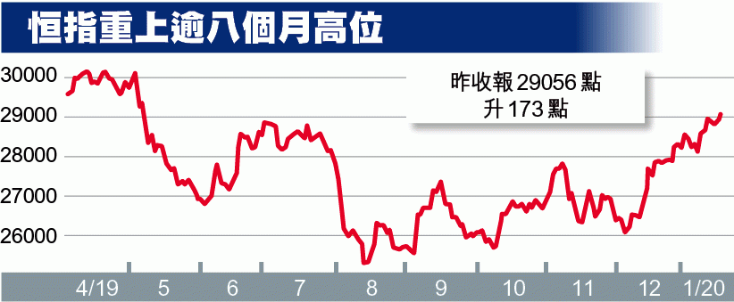 港股昨高開105點後曾倒跌,午後獲資金支持,尾市發力及U盤嘜高,收報29056點,升173點或0.6%;國指亦彈91點或0.81%,報11419點,主板成交1,113.6億元。星展香港財資市場部董事總經理王良享表示,在預期資金返回亞洲,包括追買中港落後股份推動下,加上大量中概股擬來港上市,刺激人民幣及港滙走強。人民幣離岸價一度升穿兌每美元6.86關口,港滙兌每美元則見7.7697。