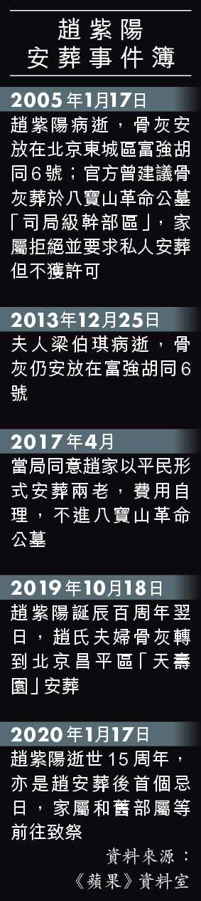 經歷多年與官方斡旋商討,趙家覓得北京昌平區的「天壽園」墓地,兩老終在趙紫陽去年10月18日的百周年誕辰翌日安葬。趙家家屬昨在安葬後的首個忌日到墓園致祭,但發現墓園與當初購買墓地時起了很大變化。墓園保安嚴密,有多名工作人員和保安員駐守,門口新增出入閘;進入墓園者要登記身份證,還要說明入內原因和拜祭何人。