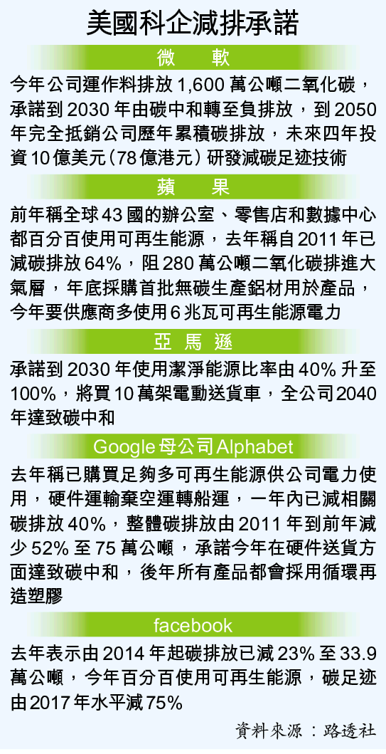 科技界近年環保呼聲四起。Google和蘋果等數間科企承諾於2030年前達至「碳中和」,亞馬遜則以2040年為目標。微軟聲稱於2012年已達至「碳中和」,但認為已不足以回應氣候變化,現將每年就碳排放量發表報告,料今年碳排放量將達1,600萬公噸。