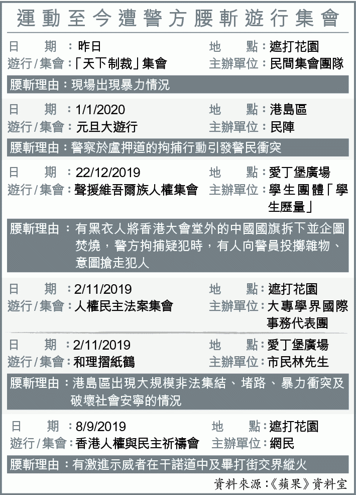 早前同樣被警方粗暴腰斬遊行的民陣召集人岑子杰認為,警方目前戰略是「批你一半(不反對通知書),斬你一半」,目的是要出現武力情況製造恐慌,「令最保守嘅和理非唔出嚟」。