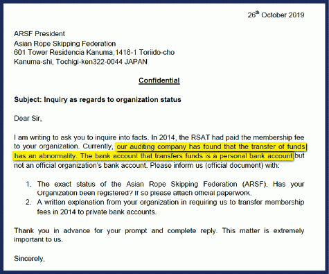 據了解,泰國跳繩總會近月核數時察覺情況有異,兩度去信亞繩盟要求解釋。第一封信去年10月發出,信中指其核數公司發現繳交的會員費被存入私人戶口,認為不尋常,要求亞繩盟交代其組織註冊現況、以及解釋以私人戶口處理會費的原因。由於沒有回音,泰國繩總11月初再度去信,要求7日內回覆,否則轉交泰國司法部轄下的特別調查局跟進。