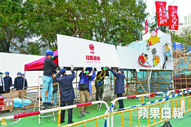 昨下午5時許,十多名食環署職員及外判工人清拆社民連攤檔,將數個籌款箱及十多盆花搬開,待社民連自行運走,並清拆寫有反修例口號的橫額,以及印有特首林鄭月娥、警務處長鄧炳強、國家主席習近平等政治人物裝飾。