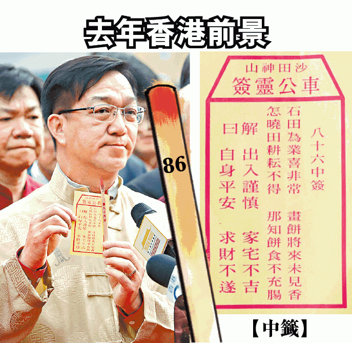 去年劉業強在車公廟求得86中籤,籤文為「石田為業喜非常,畫餅將來未見香;怎曉田耕耘不得,那知餅食不充腸。」解曰︰出入謹慎、家宅不吉、自身平安、求財不遂。去年陳天恩形容籤文預視香港未來一年形勢非常之差,更曾揚言︰「(香港)來年有好日子過,斬我個頭當凳坐!」