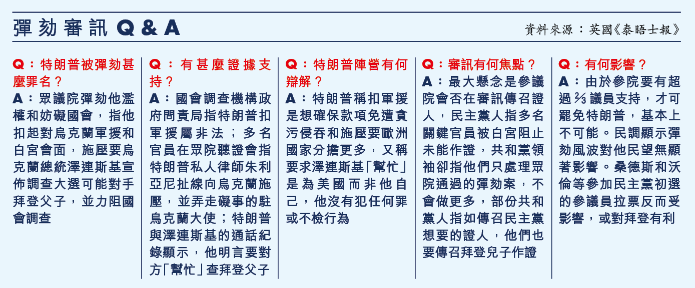 至於審訊焦點──參院會否傳召對「烏克蘭門」知情但因特朗普阻止而未在眾院作證的白宮官員,麥康奈爾就提議留待參議員發問環節後討論,時間更只有4小時。若參院表決決定不傳召新證人,參院就會表決兩項彈劾條文──「濫權」及「妨礙國會」,需2/3議員贊成才可通過將特朗普罷免。