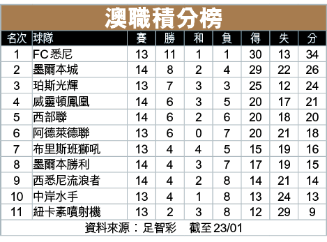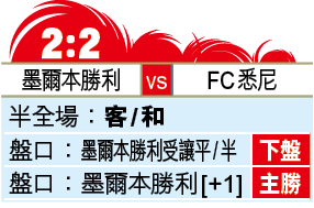 澳職「年三十」爆發國家打吡,周五由墨爾本勝利主場對FC悉尼;勝利上仗亞冠盃大勝,總算取得新帥沙華祖亞首勝;相反FC悉尼雖三連勝,但近仗「點到即止」,博勝利主場不敗,受讓平/半取下盤,亦可敲「主客和」的和局,一團和氣。(球賽編號:星期五2;now639、有線655及無綫myTV Super302台今日4:30pm直播)