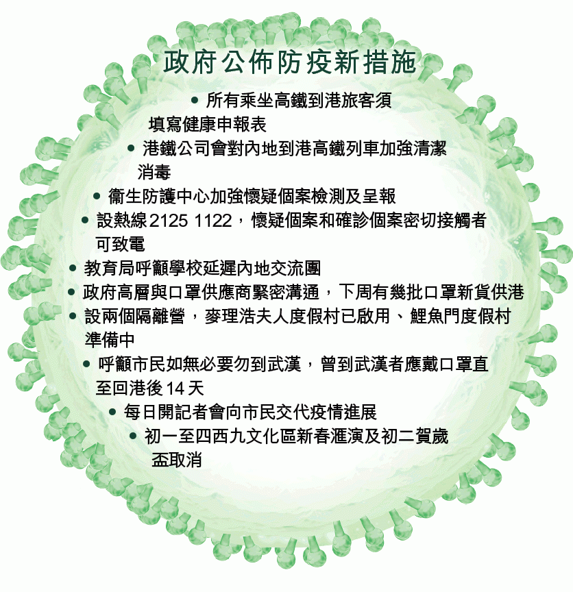 他又表示,已呼籲學校延遲內地交流團,至於農曆新年假期後會否繼續停課,要視乎疫情而定,教育局會預早宣佈。政府每日會舉行記者會交代疫情進展。年初一至初四的西九新春匯演及年初二賀歲盃亦取消,避免人群聚集。