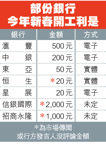 去年適逢百年行慶、派發特別利是3,888元的東亞銀行(023),今年回復常態每封派50元,但仍較前年的20元為高;東亞發言人表示,今年將向同事派發50元開工利是。