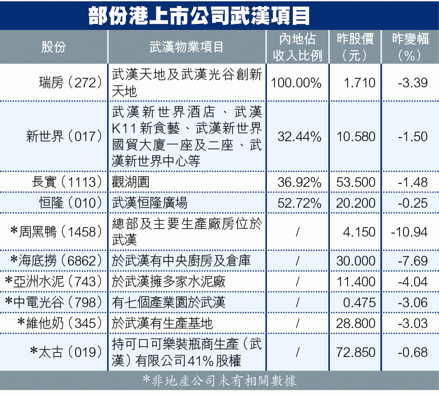 一些二線華資地產商亦有在武漢插旗。恒隆(101)在當地發展的武漢恒隆廣場等,估計在今年至2022年分期落成。「上海姑爺」羅康瑞旗下瑞安房地產(272),則在當地擁有兩個項目,應佔可供出售面積逾80萬平方米,佔整體約20%,現時正在建設中並正預售,預期將會導致其完成進度受影響,售樓及租金入賬亦有所推遲,或打擊盈利狀況。