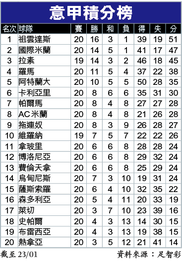 反觀米蘭自伊巴回歸後,全隊狀態越來越好,近2仗更狂轟6球,今仗只要全取3分更闖入前6,鬥心不容懷疑。除伊巴已開齋外,連帶森姆卡斯迪利祖、列比錫等人亦回勇,就連左閘迪奧靴南迪斯亦頻頻取得入球,今仗作客讓半/一照撐米蘭開上盤。