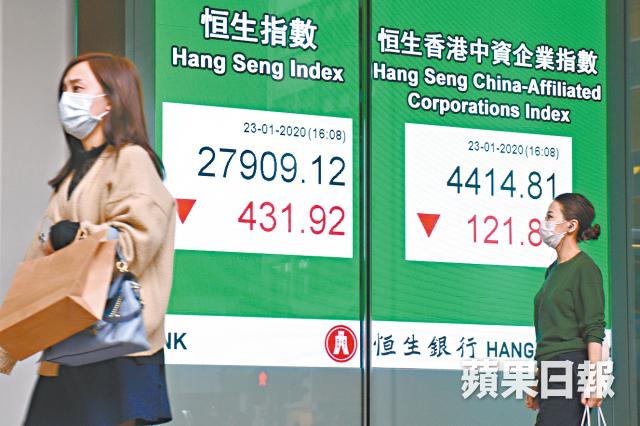 港股亦「彈完散」,昨低開231點後隨A股插水,午後曾瀉634點,低見27706點,收報27909點,挫431點或1.52%;國指報10952點,軟223點或1.99%,成交增17%至1,187億元(港元.下同)。亞洲多國出現武漢肺炎確診個案,日股挫235點或0.98%,韓股軟0.93%。