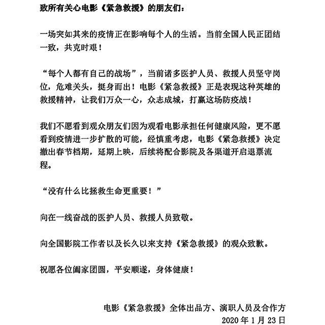 7部內地賀歲電影昨日分別在微博發出聲明,表示因受新型冠狀病毒肺炎疫情影響,宣佈撤出春節檔,稍後才再安排上映,同時片方向已預購門票的觀眾保證一定可以得到退票安排。其實內地賀歲片早前已開始接受預訂門票,但由於受疫情擴散及政府向民眾呼籲避免去人多地方,令賀歲片在春節預售銷情冷淡。