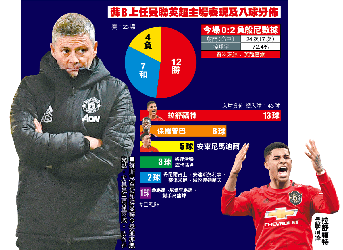 曼聯攻門次數多達24次,當中僅7次命中目標0入球。賽後24戰得34分是89/90球季以來最差同期成績。事實上,自蘇B在2018年12月以看守領隊暫時接手,起初戰績雖然亮麗,但表現每況愈下,前者重用的前鋒拉舒福特在紅魔佔極重要的角色,今仗亦是蘇B上任以來,23場曼聯英超主場比賽首次出現福仔缺陣情況。該23場比賽紅魔勝出12場共入43球,當中福仔便佔最大比重13球,次席射手為入八球的保羅普巴,但他自蘇B接手初期一段強勢後已沉寂多時,今季更受傷患困擾上陣有限,曼聯要走出困境,苦等最快要到季尾才能傷癒復出的福仔或者為時已晚;趁冬季轉會窗尚有約一星期時間才關閉,球會方面要加速增兵步伐。