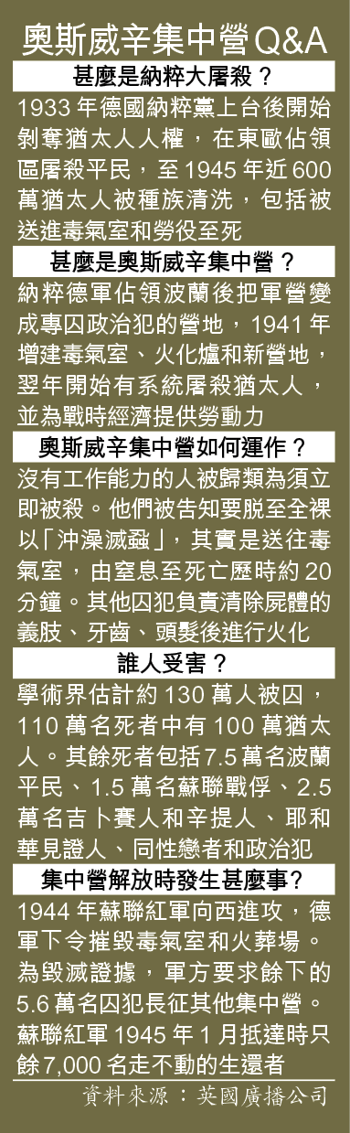 象徵人類歷史數一數二醜惡一頁的波蘭奧斯威辛集中營,昨日舉行解放75周年紀念儀式。隨着倖存者年事漸高,出席人數漸少,在歐美當前反猶太情緒升溫、世界多地有剝奪自由與人權的暴行下,這群親身承受過殘酷迫害的倖存者,希望透過分享經歷,提醒世人當心提防悲劇重演。