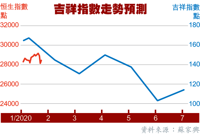 蘇家興於2018年底的公開講座中,以自製「吉祥指數」預測來年全球運勢,及後回顧,其指數升跌與恒指全年走勢十分相似。鼠年伊始,蘇師傅向本報提供未來半年的吉祥指數預測,顯示運勢自1月後便持續向下,反映經濟形勢一樣不樂觀。