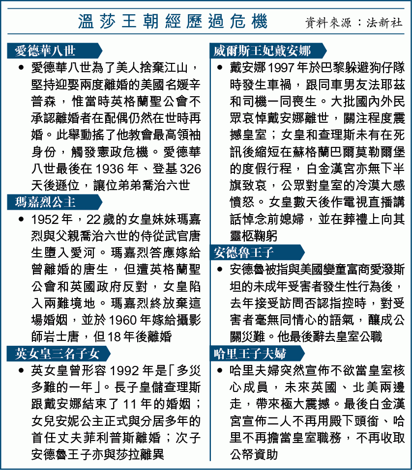 伊利沙伯二世1952年即位,至今67年,也不只一次面對共和主義高漲、輿論對皇室尖刻批評,尤其是「多災多難」的1992年,皇室家醜大爆發,女皇三子女包括皇儲查理斯都婚姻破裂,民調指四分三人相信皇室分崩離析,以至溫莎堡大火民眾怒拒用公帑維修。女皇傷心之餘從善如流,決定開始繳稅、削減公帑資助的皇室成員及開放宮殿,以財務改革息民怨。