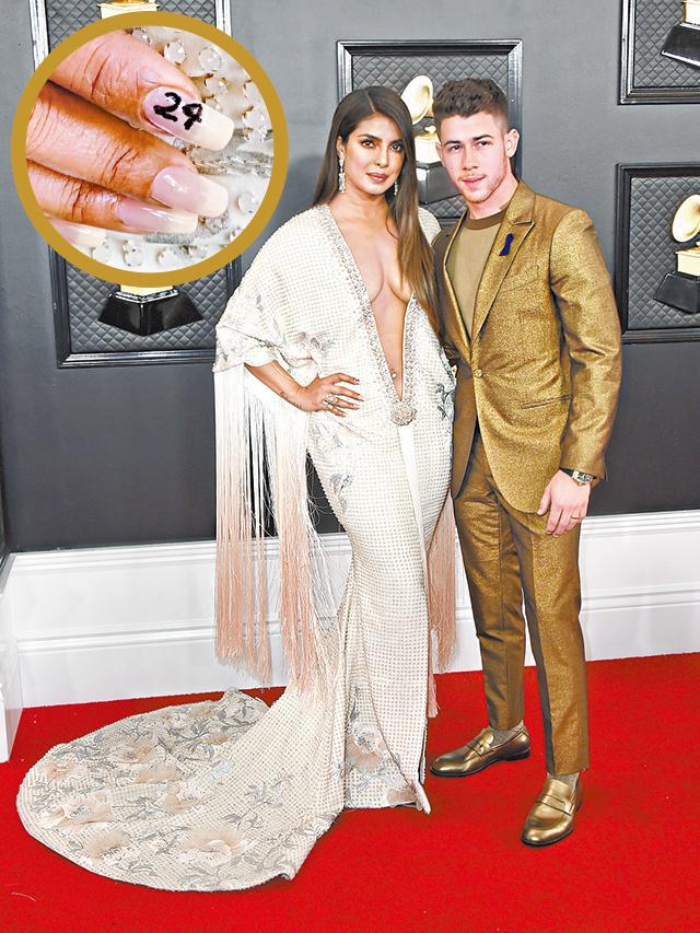 今屆格林美紅地毯睇頭多多,Nick Jonas的女星太太喬普拉(Priyanka Chopra)博到盡,穿上Ralph & Russo的設計,真空上陣兼中門大開,還在指甲上塗上已故NBA球星拜恩球衣號碼「24」以示悼念。