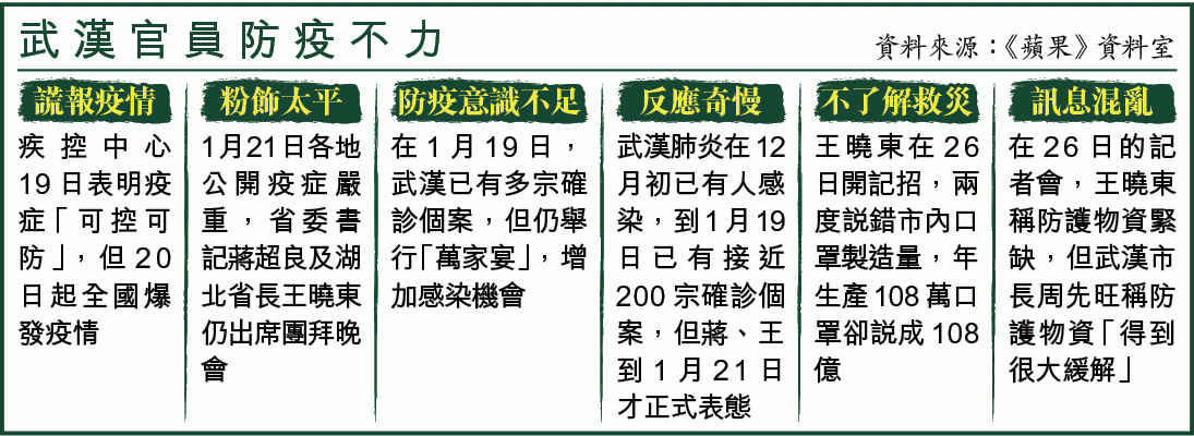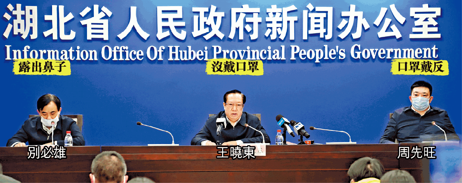 武漢早前已推行「武漢版蒙面法」,規定任何人在公眾地方必須戴口罩,否則送官。王曉東、周先旺及別必雄三人出席記者會,戴口罩各有異相:周戴口罩卻上下倒轉,防疫成疑:別戴口罩卻沒有掩鼻,形同虛設;王更是沒有戴口罩,罔顧法例。三人完全沒有帶同起示範作用,教人驚訝。